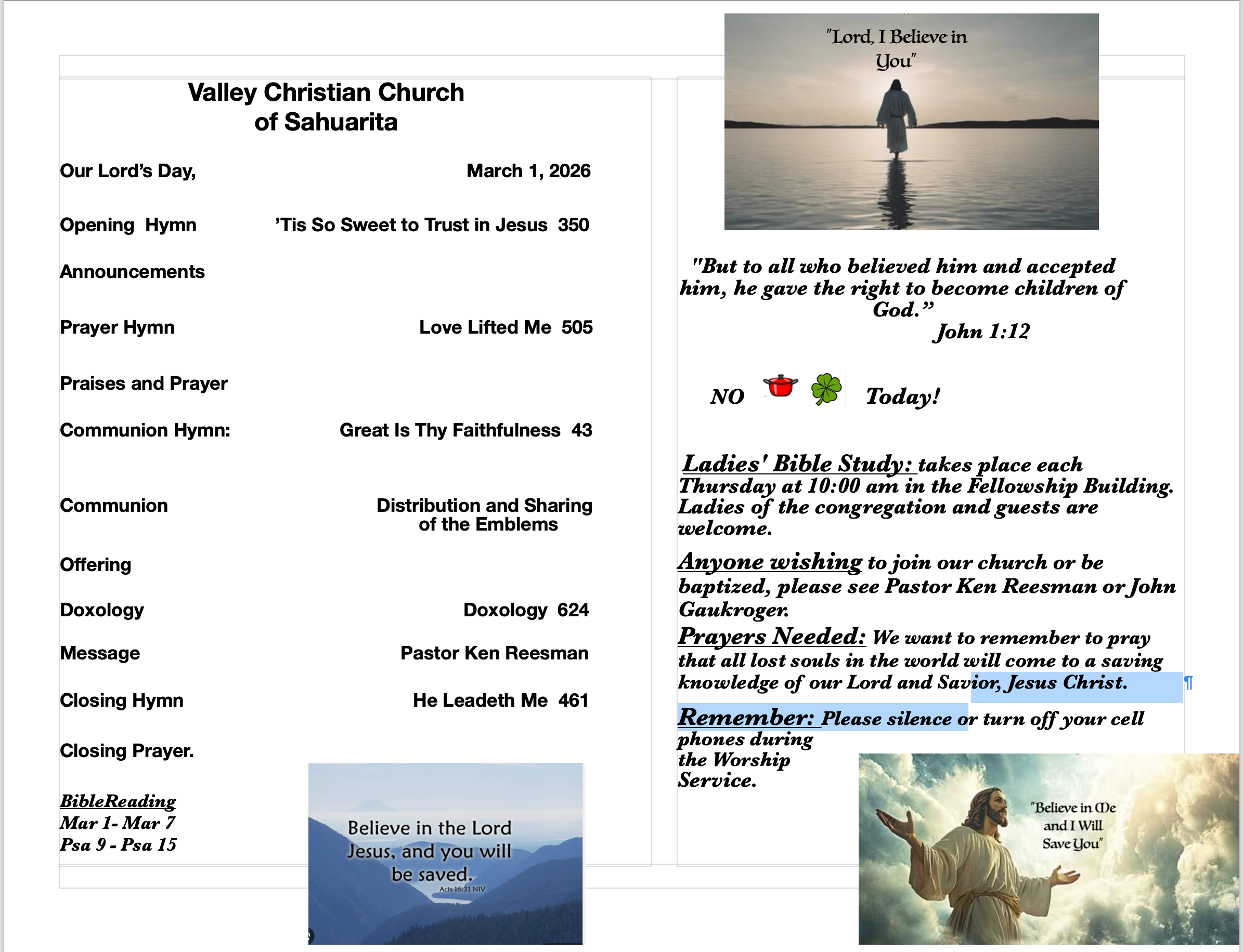 Pastor Ken will be having a Prayer Service along with The Lord’s Message again on Sunday. You may send your Prayer Requests to Pastor Ken or through Our Website. Just go to the bottom of Our Website and fill out your Prayer Requests. Pastor Ken will receive every Prayer Request. Have a Blessed Week…